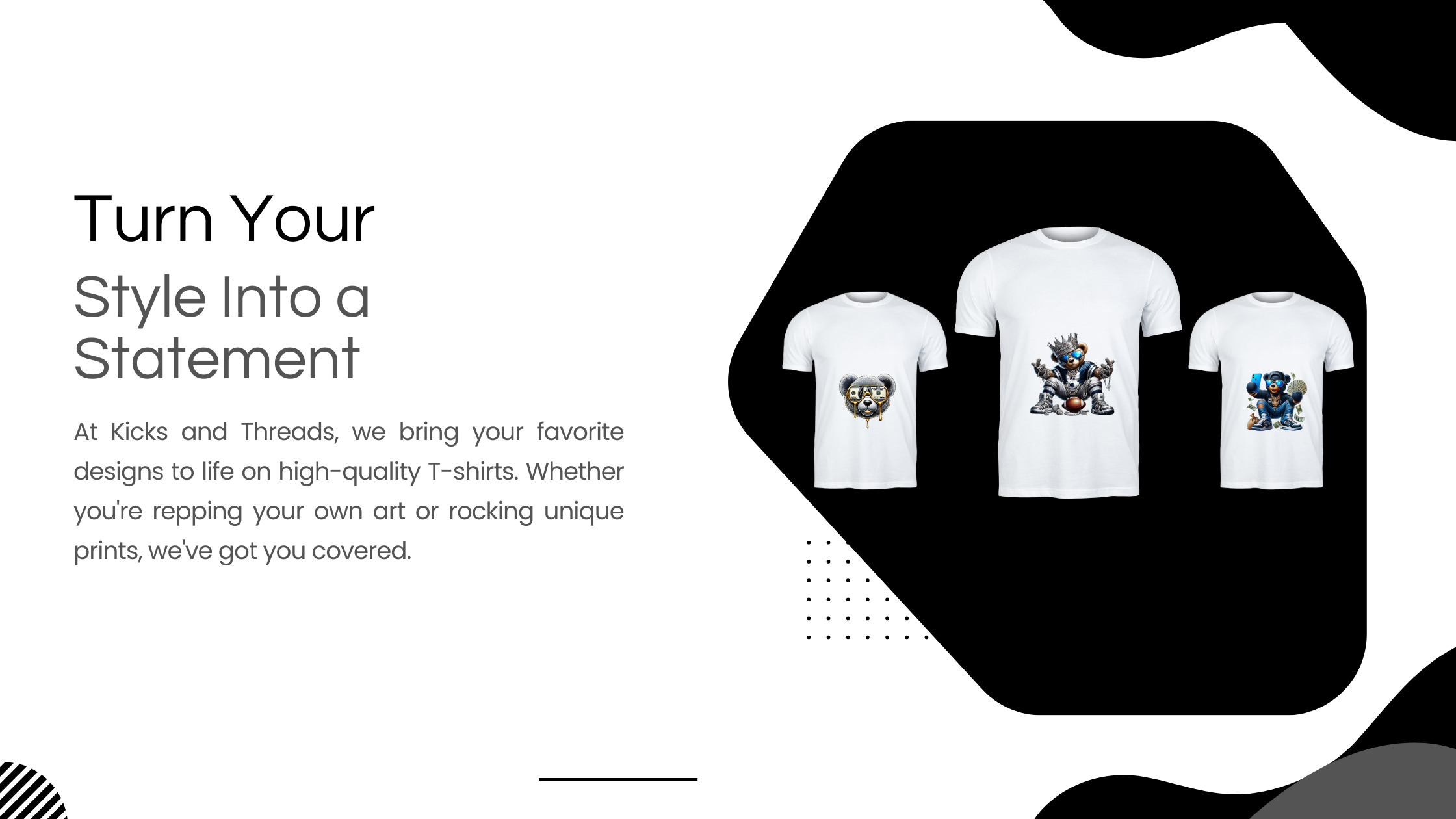 Kicks and Threads is where creativity meets fashion. We specialize in T-shirts that showcase vibrant, high-quality prints tailored to express individuality. Whether you're looking for bold graphics, subtle designs, or a custom touch, we're here to make it happen.